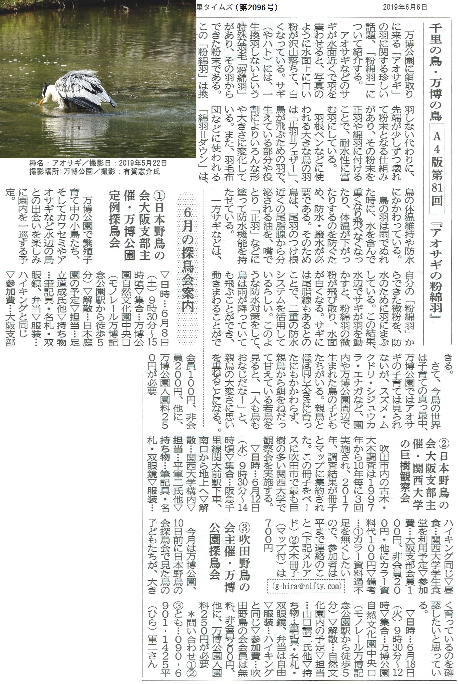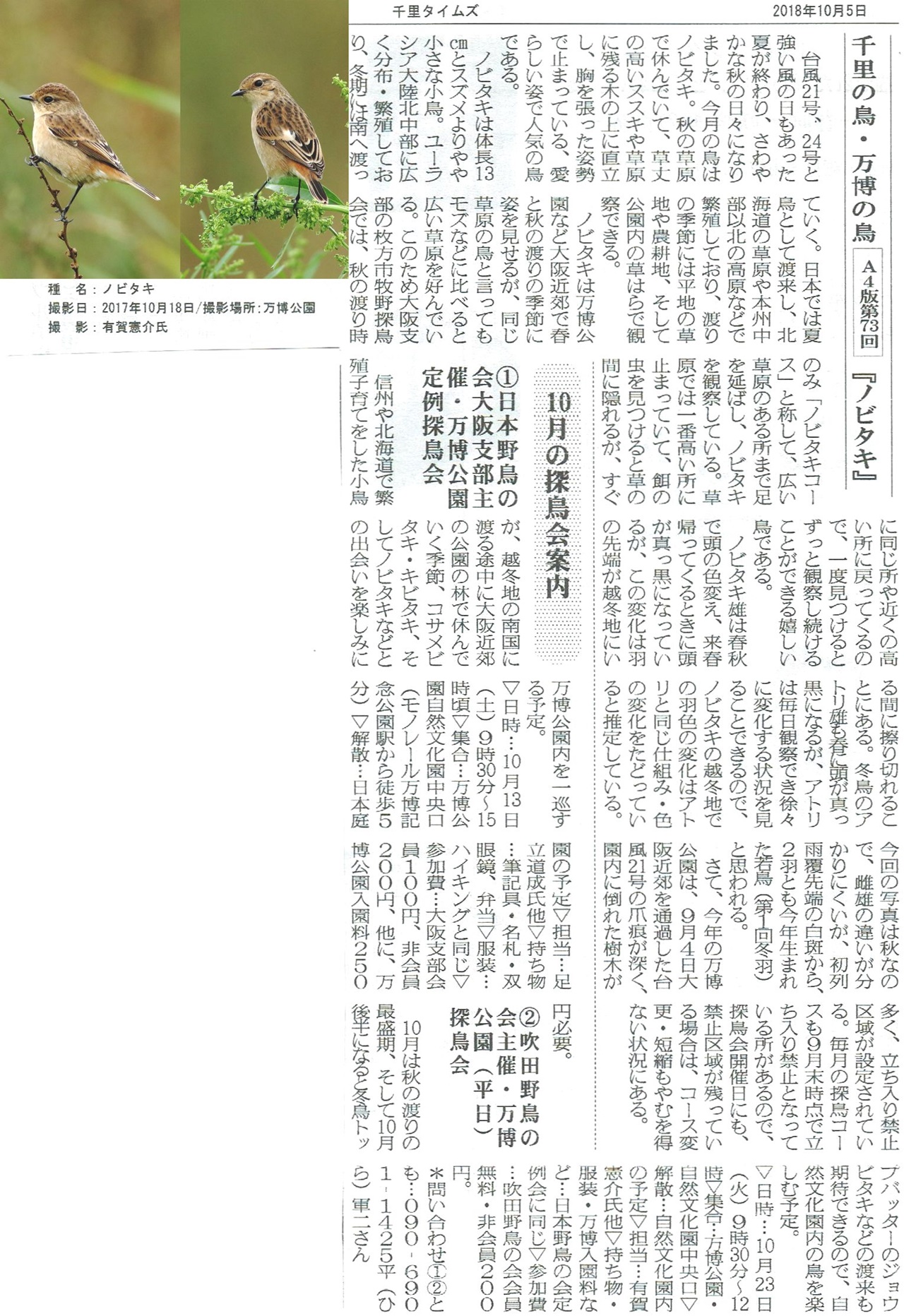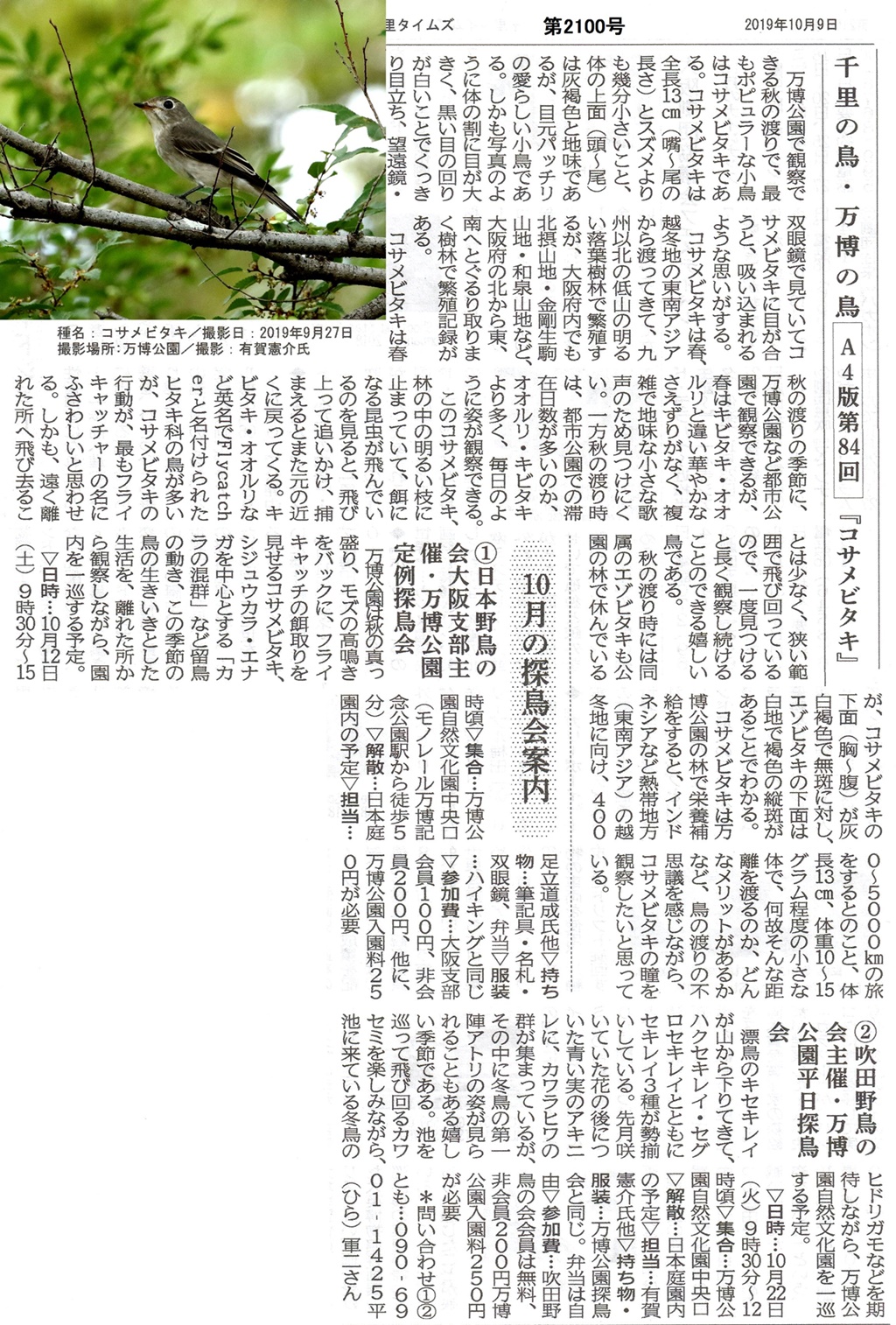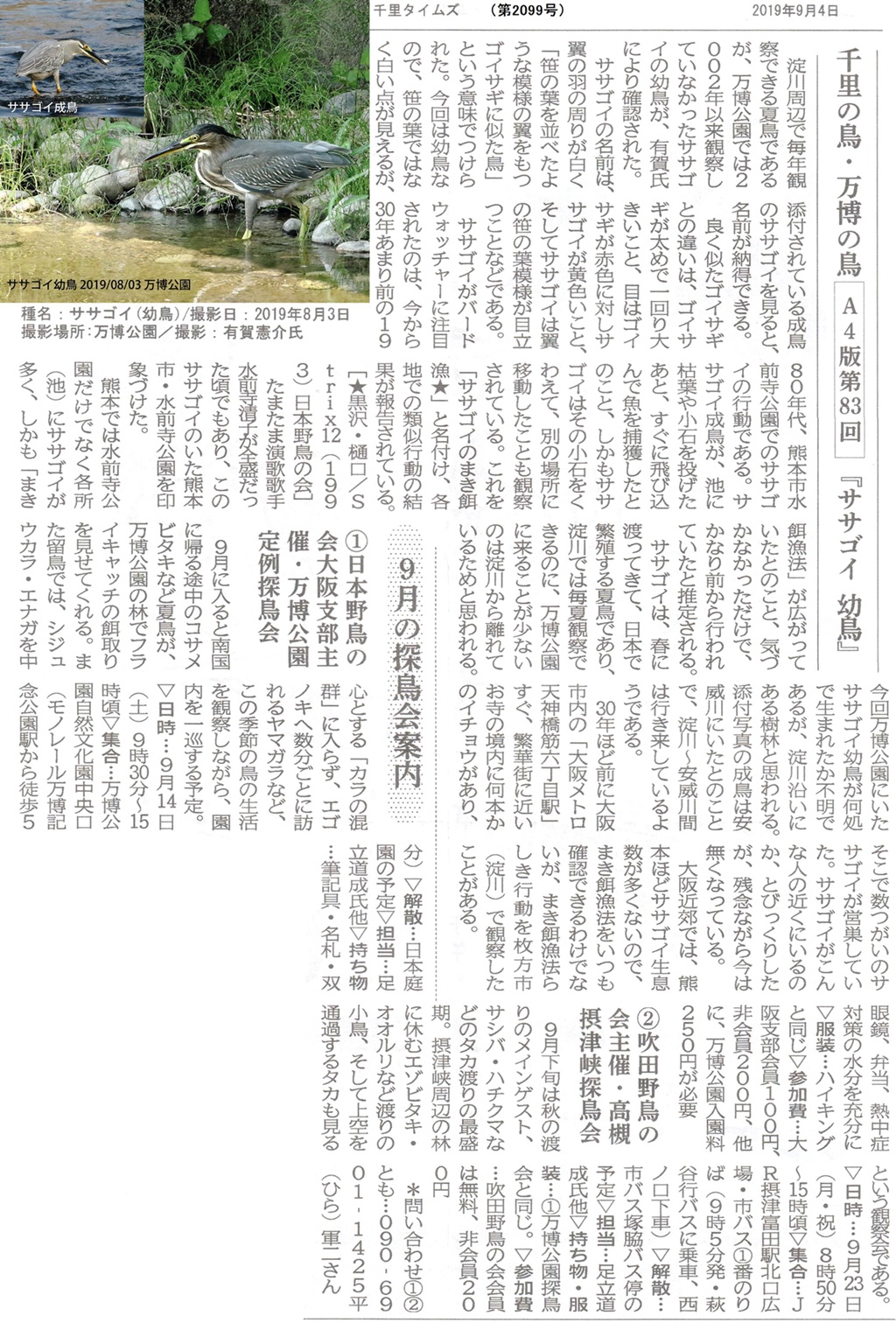 (9月2日更新):9月の定例探鳥会はお休みです。番外編の千里の鳥の案内