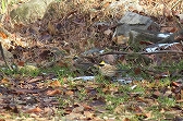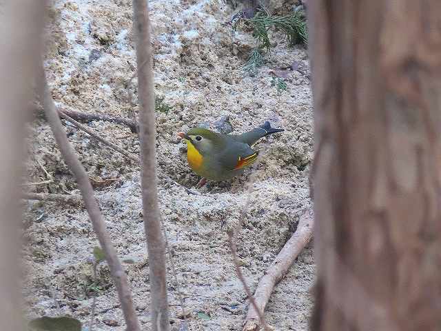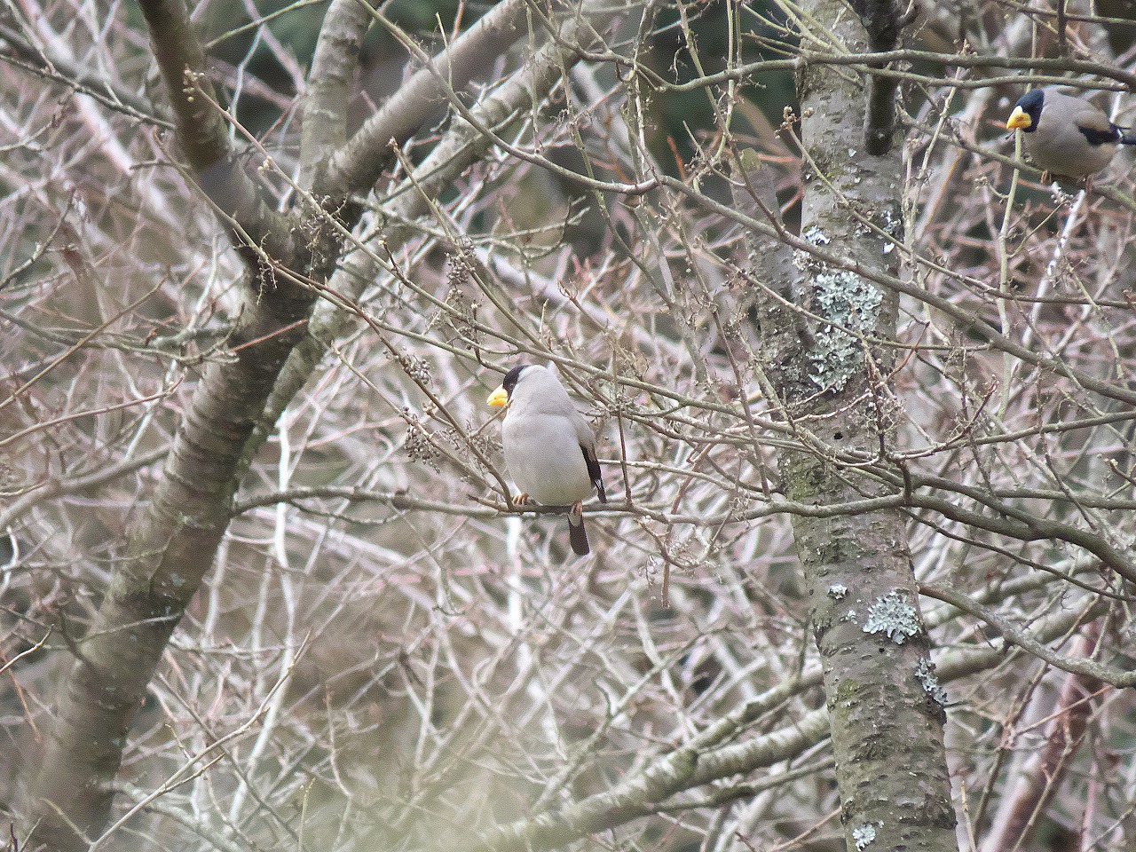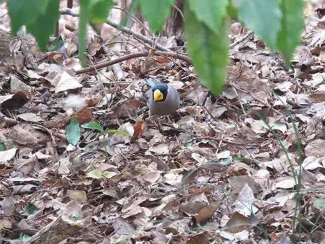 - 梅林横のトイレ裏で地上に降りているイカルの群れ。