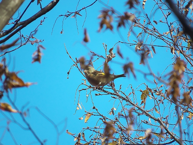 中腹でハイタカやノスリが青空に舞う。時折イカルの群れが移動する。