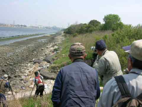 - 途中グラウンド付近の草原で今日のお目当てのノビタキをジックリと見る。矢倉海岸は満潮時と重なり水位は高く、残念ながらカモの姿はない。今日は24種と出現数は少なめであったが、メボソムシクイ、チョウゲンボウ、ノビタキ等がジックリと観察でき、参加者の皆さんは満足された様子だった。