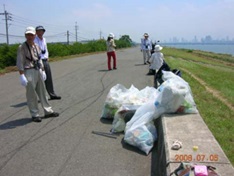 - 淀川の堤防は一斉に雑草が刈り取られ、そのためかゴミは少ない。しかし、水際は相変わらずペットボトルなどの漂着ゴミは多い。神崎川河口は先に誰かが清掃してくれたのか、例年に比べゴミは非常に少ない。