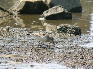 - 暑さはお盆過ぎても衰えず参加者はあるのか心配したが3名とリーダー4名の参加あり矢倉緑地に向かった。7月に清掃探鳥が実施できずやたらゴミが目につく。舟だまりでダイサギ、ホシハジロ、キンクロハジロ、カルガモを観察した。矢倉干潟に向かう道は草が伸びて歩きにくい。干潟でコチドリ、シロチドリ、トウネン、キアシシギ、イソシギ等観察した。干潟にはハクセンシオマネキもかなりの数で姿を現していた。
