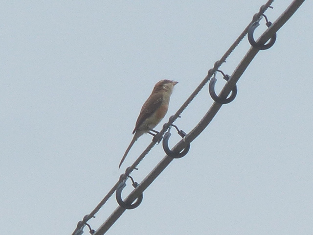 - 幼鳥らしいモズが飛んできて、電線にとまる。