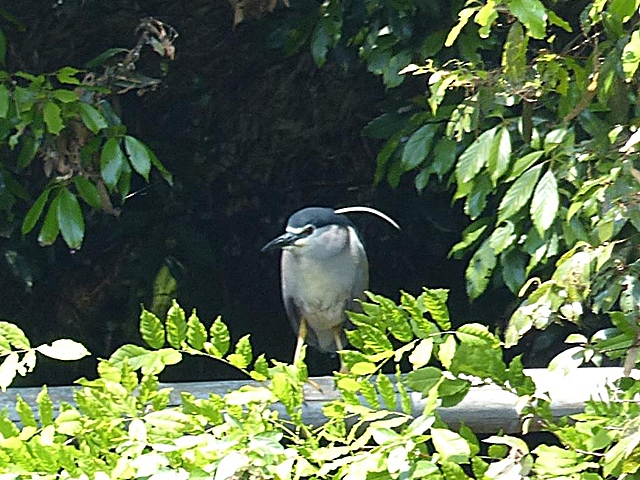 - 法道寺裏の上池では、ゴイサギが倒れた竹に止まり、白い冠羽を光らせていた。