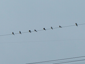 - 農耕地に来ると、旅立ち前のツバメが電線に列をなし羽を休めていた。