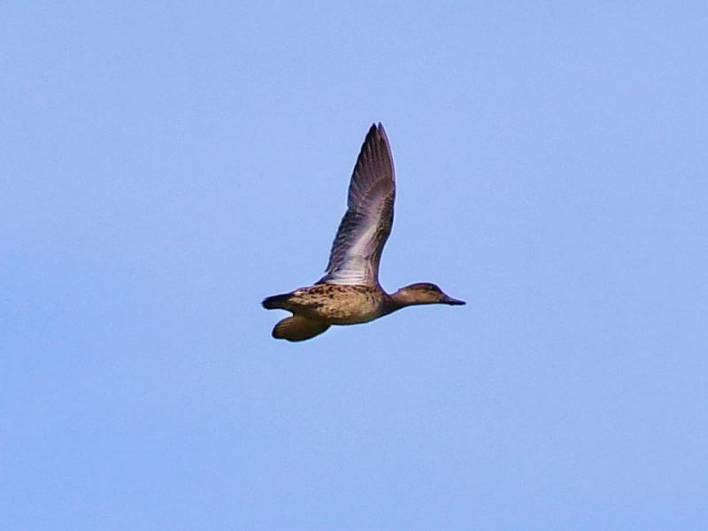 午後、タカ見台下の曲玉の池から突然1羽のカモ(写真)が飛び立った。