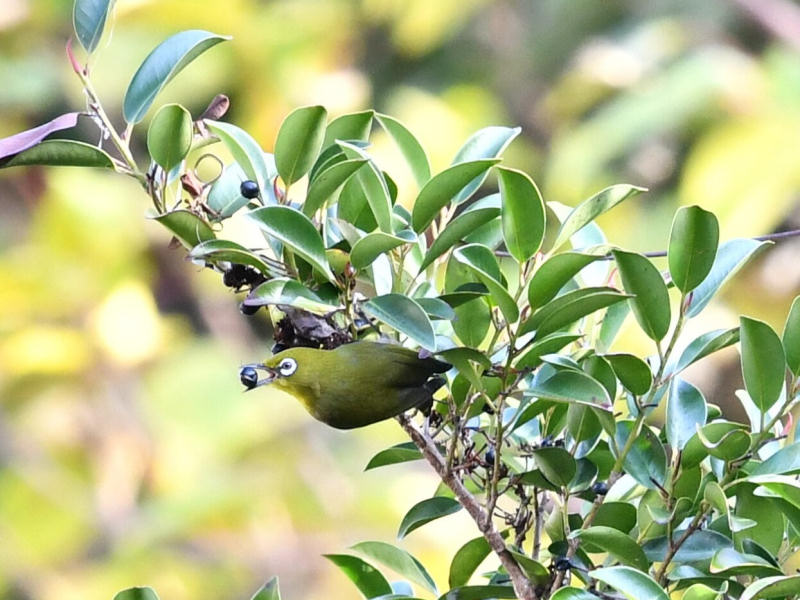 集落の叢林でメジロやエナガ、ヤマガラなどのカラ類の混群に出会う。