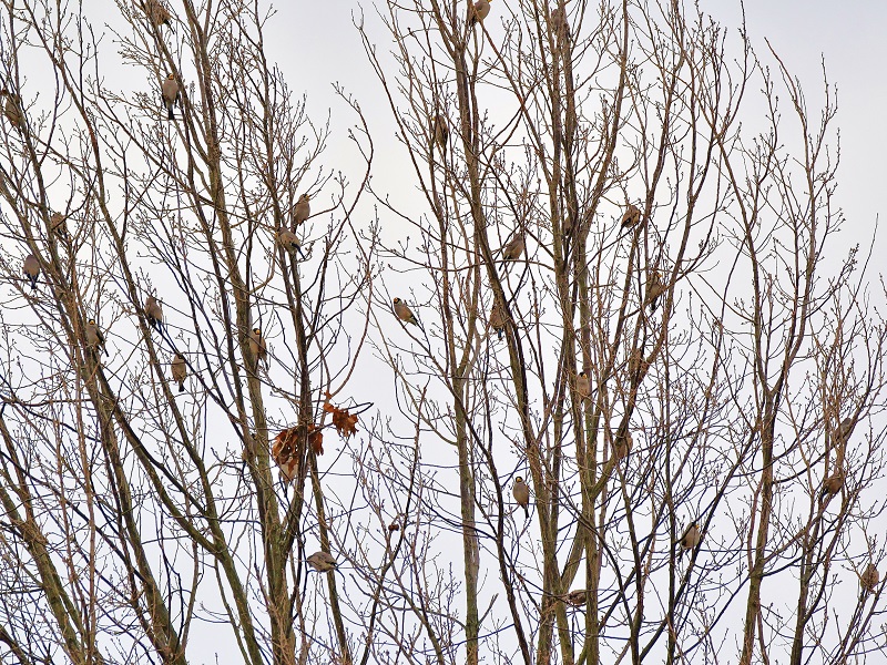ムクドリやカワラヒワの群が上空を飛び交う。
