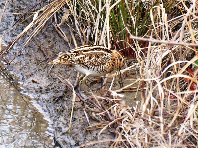 農耕地の溝でタシギ1羽が脇目も振らず採餌中。