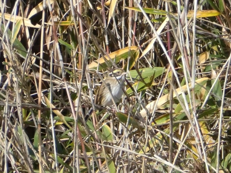 タカ見台下の田んぼで、ホオジロやミヤマホオジロ、アオジに交じって、当地では初認のキマユホオジロを観察。