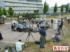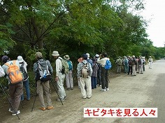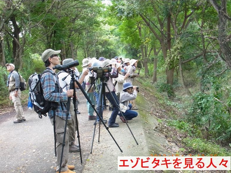 - (左下)エゾビタキを見る人々上記キビタキを見ている環境もそうですが、写真で見ると淀川河畔ではなく、里山の林道でバードウォッチングをしているかに見えます。