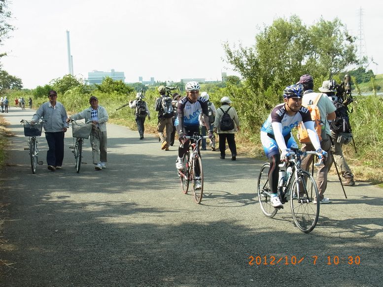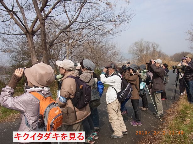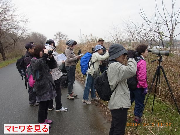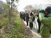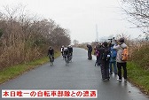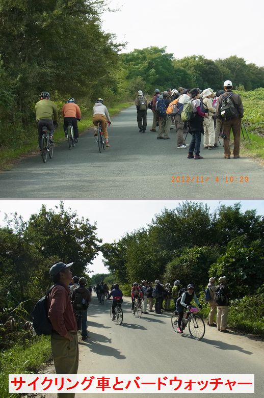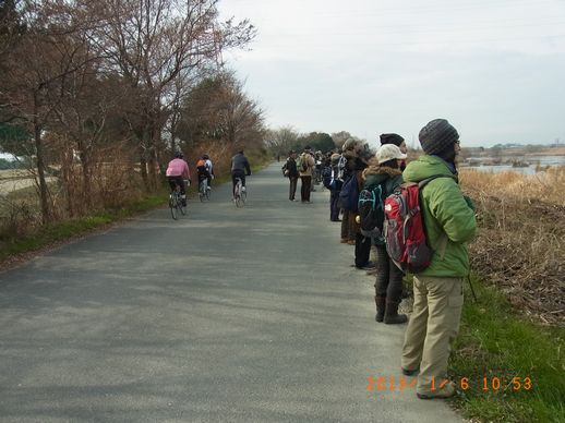 - (右下)サイクリング車との擦れ違い:牧野探鳥会のコースはサイクリングロード、今日、探鳥コースで出会った自転車の数を堤(美)さんにカウントしてもらいました。その結果何と231台、事故なく終わったことに感謝するのみです。途中でサイクリング車の2人が「鳥を見る人が増えたね」と言って通り過ぎましたが、どちらが増えたかは言うまでもありません。