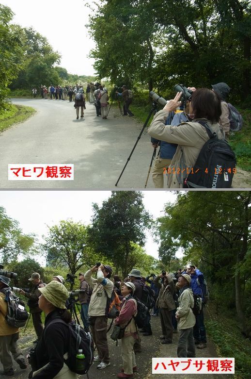 - 上左端:探鳥風景:マヒワとハヤブサを観察している所。ハヤブサの観察している所はサイクリング車が通らない所なので、道いっぱいに広がってゆっくり観察しています。