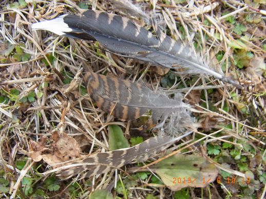 - 今日は観察できませんでしたが、タカに襲われたヤマシギの羽が落ちていました。(ヤマシギの尾羽の先端はやや尖っていて、上面が灰色、下面は銀白色(一番上の羽)でした。更に、ヤマシギの羽が落ちていた少し下流で、ハイタカが急降下し、センダン・トウネズミモチで採餌していたツグミ(+ヒヨドリ)100羽ほどを蹴散らしました。しかし、ハイタカの襲撃は失敗したようです。)