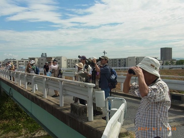 - 穂谷川に並んでいたセグロセキレイ・ハクセキレイを観察する参加者