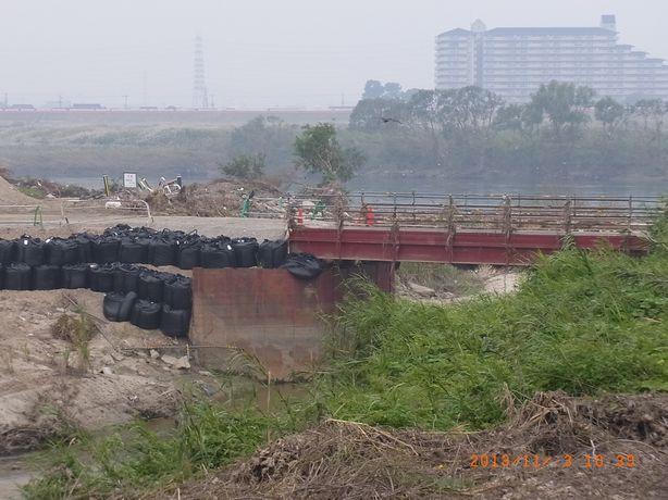 - 豪雨で流された緊急用車道橋の上流に仮設橋が設置され、通行止めが解除されたため、通常の枚方市駅方面へのコースとしました。