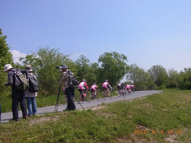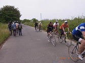 - お揃いの赤い服のサイクリング部隊、20台以上が縦列で通過しました。