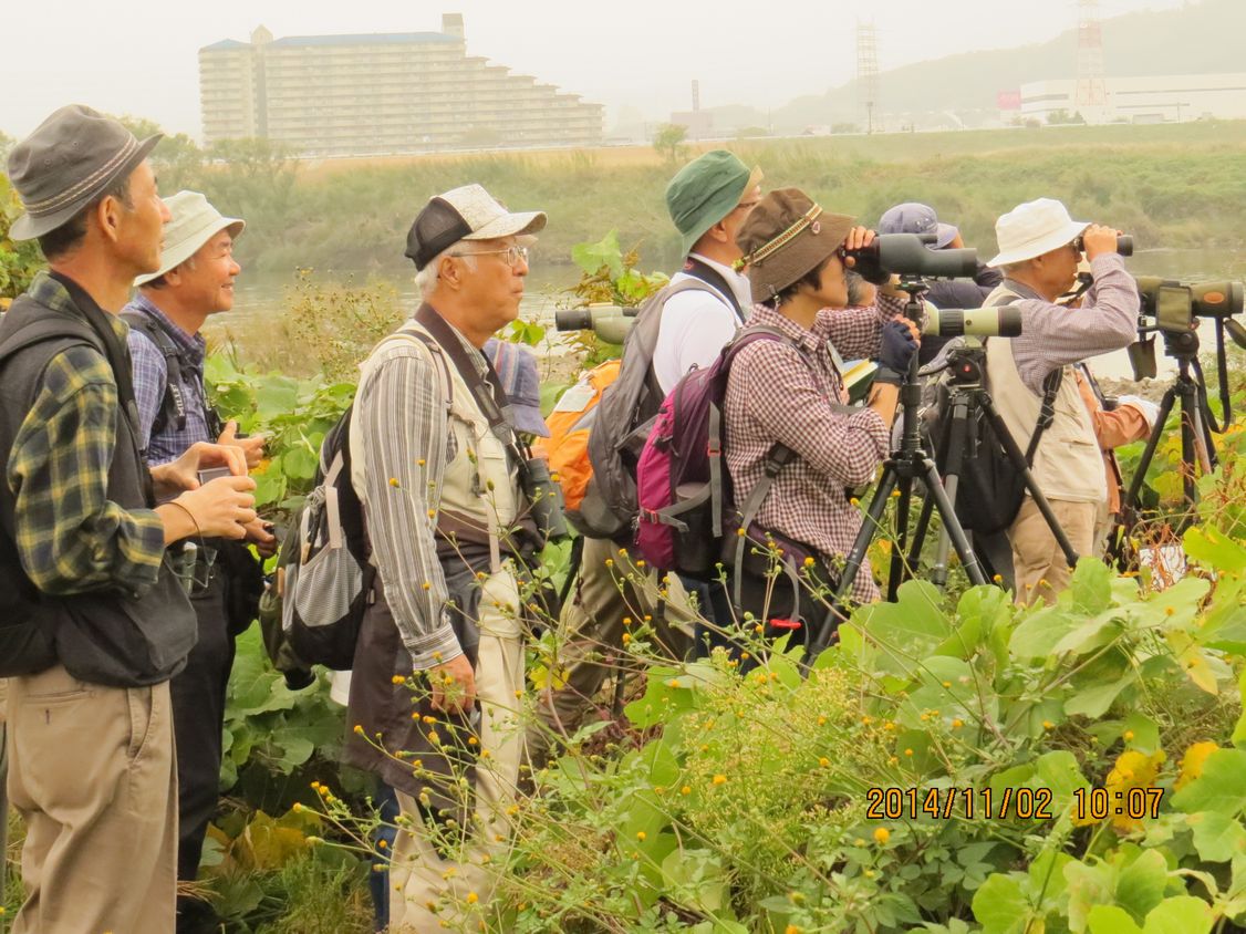 - 淀川本流の遠くにいるシギ(見えにくいのであれこれ出たがクサシギ)を見る(撮影:平さん)