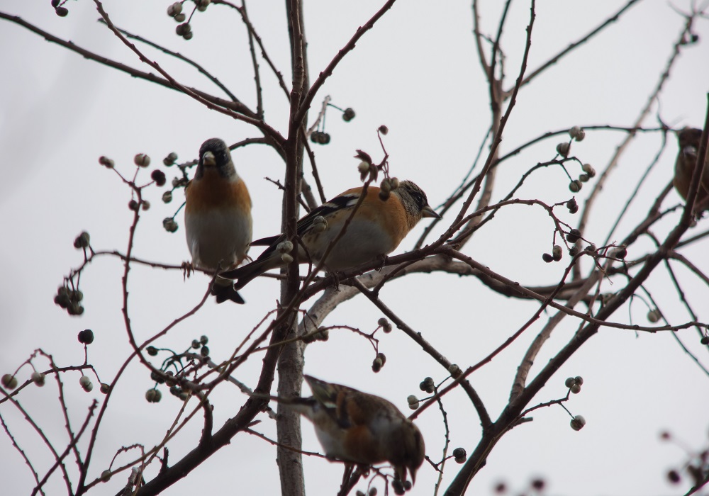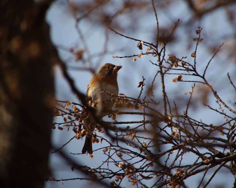 - センダンからセンダンへとひっきりなしに飛び回るムクドリやヒヨドリの群、その間にカシラダカ・アトリ・ツグミ・シロハラなどが次々出た上、お目当てのベニマシコ、更には1羽ずつながらアカハラ・ミヤマホオジロなど、山野の冬鳥オンパレードとなった。