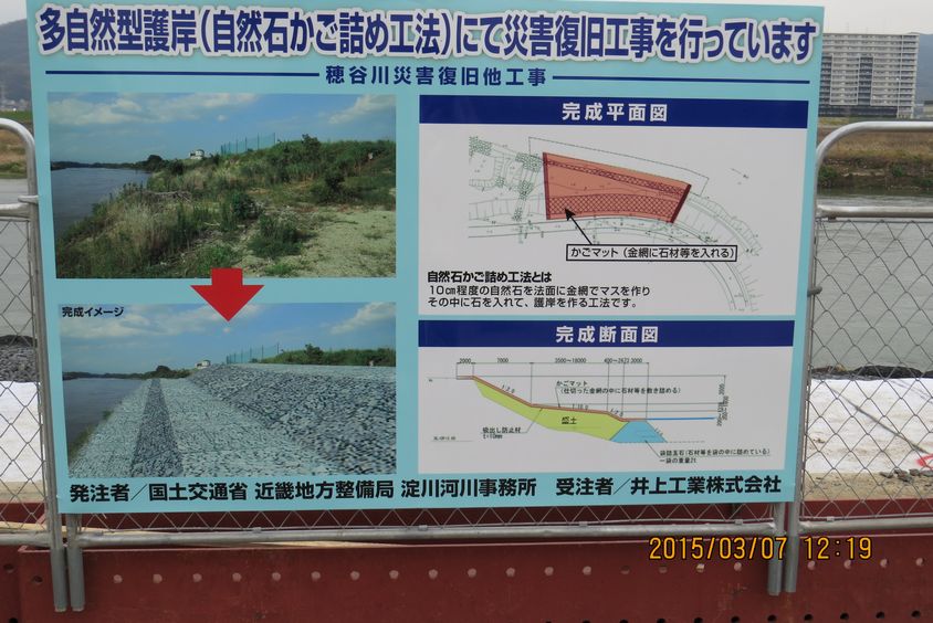 - 穂谷川の改修工事に伴う通行止めがあり、まず上流に歩き、ワンドや河川を観察したのち、右岸堤防上を下流に歩いた。