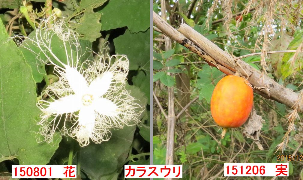 - 8月ツバメのねぐら入りでカラスウリの花の開花を観察したが、今日は赤い実があちこちで