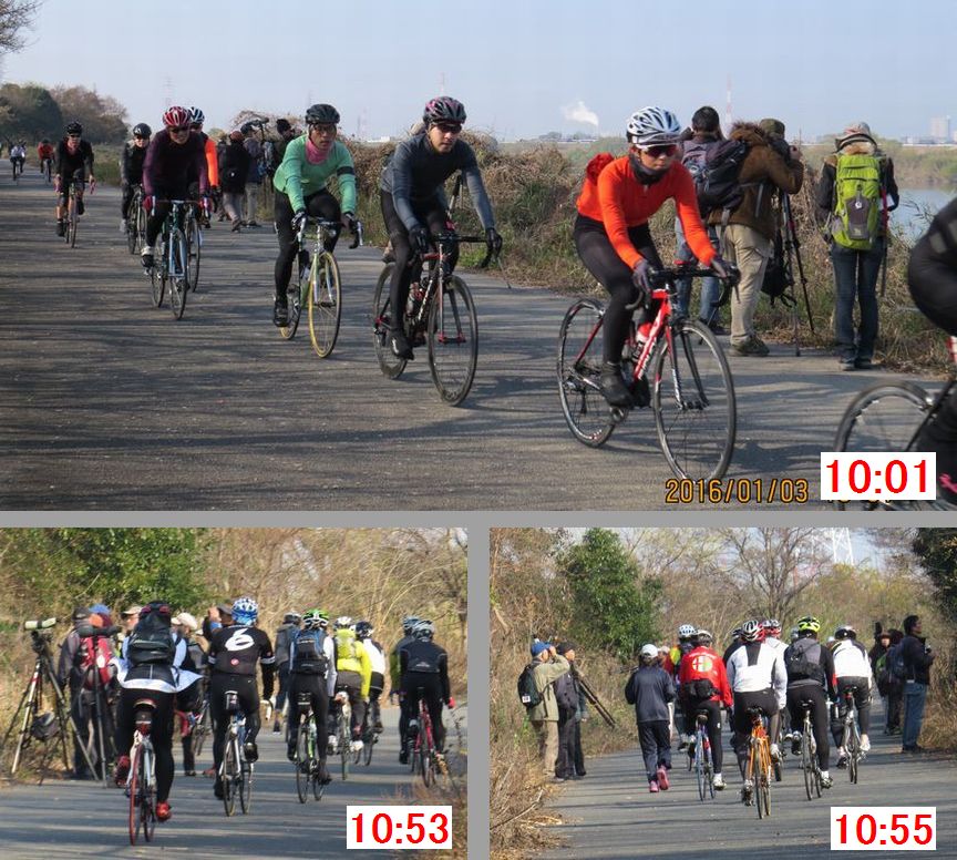 - 新年早々、自転車部隊が例月より多く、数台〜10台の群で次々、500台以上は通過したと思われる。