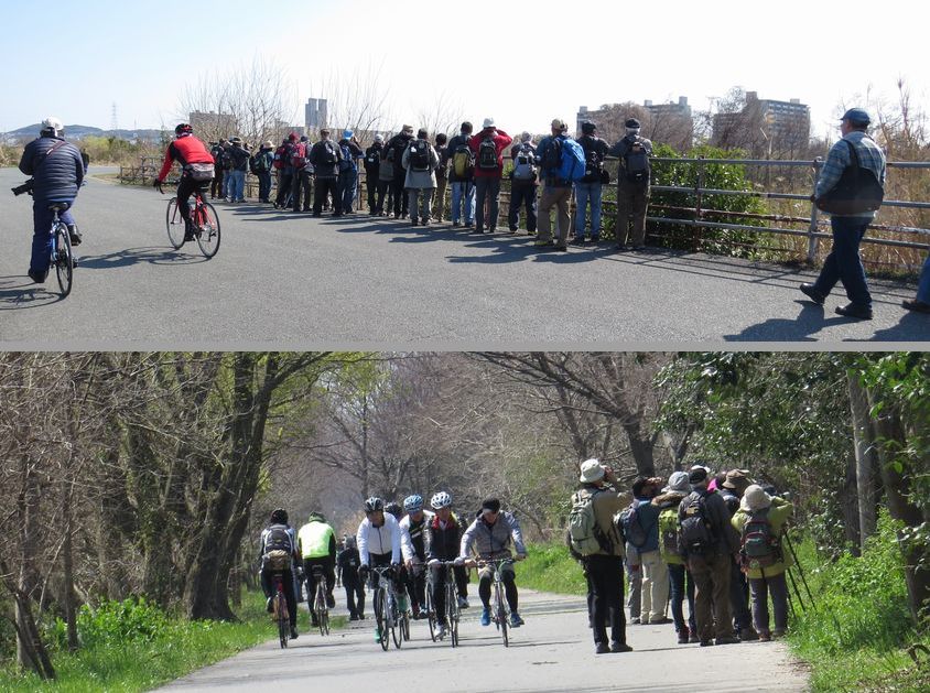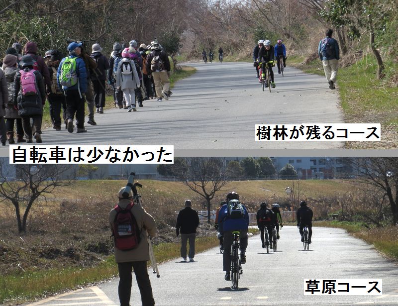 常にサイクリング車が走行していた。上段:ベニマシコを見る。下段:ウグイスを見る。