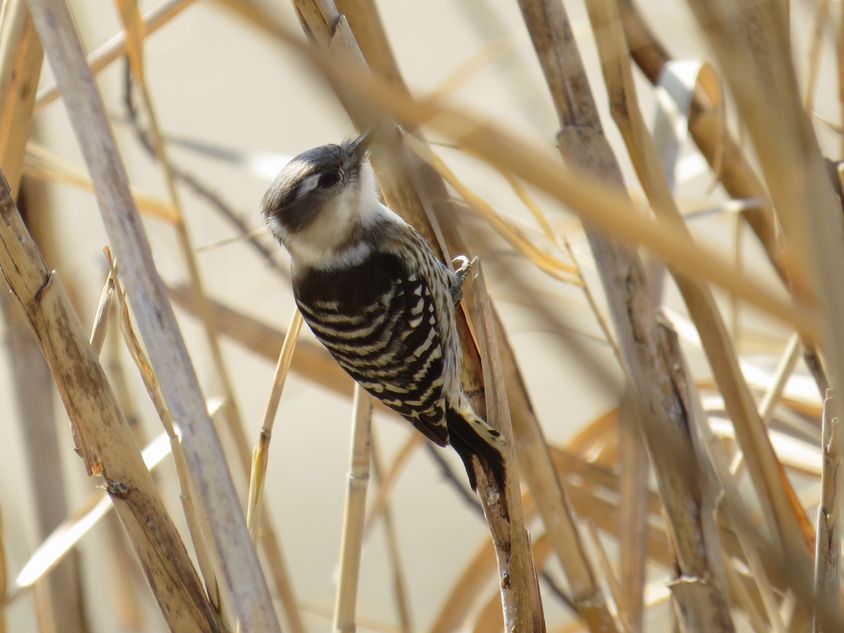 コゲラ ヨシ原で餌探し(この近くに竹でドラミングのコゲラもいました)