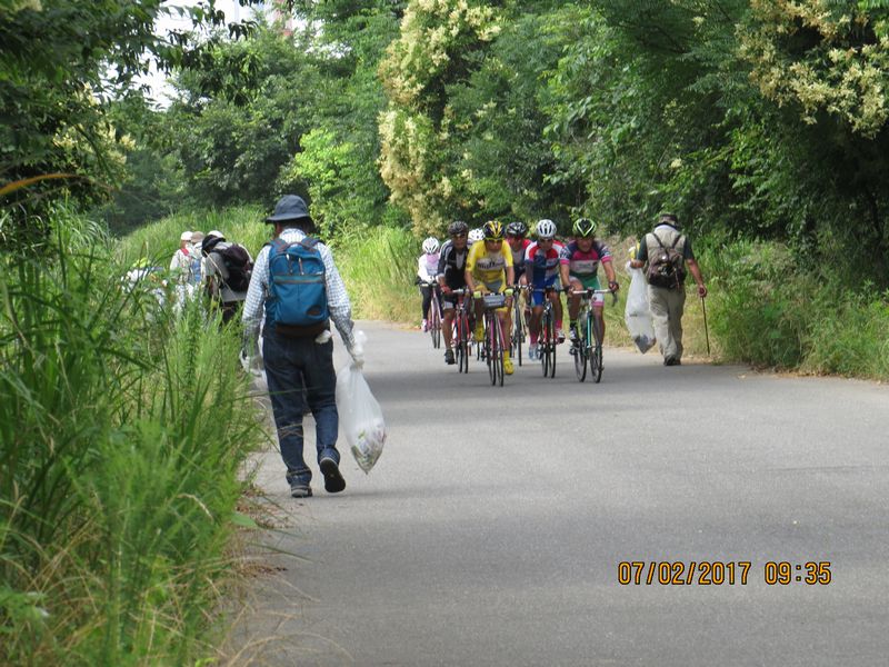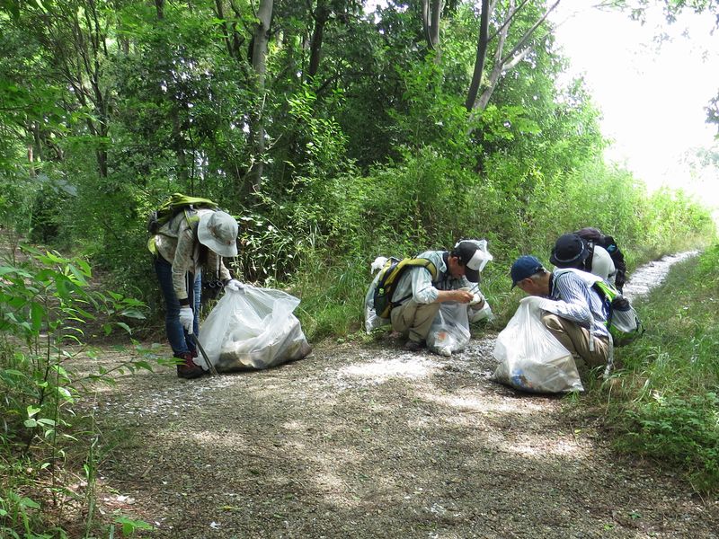 コースには思いのほかゴミが少なかったが、所々に「缶・ビン・ペットボトル」などがまとまって捨てられている所があり、全員で集めたごみは大袋10個となった。