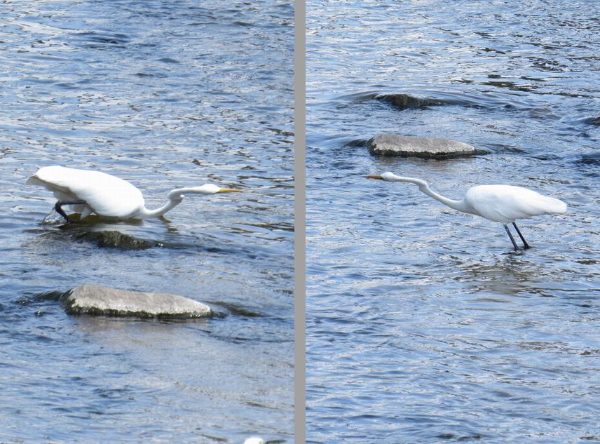 ダイサギが右を向いたり左を向いたりして、狩漁(撮影:平さん)