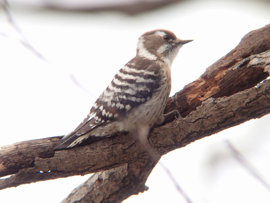 コゲラ:長い間枯れ枝を突いて、ウォッチャーを歓迎(撮影:西脇さん)