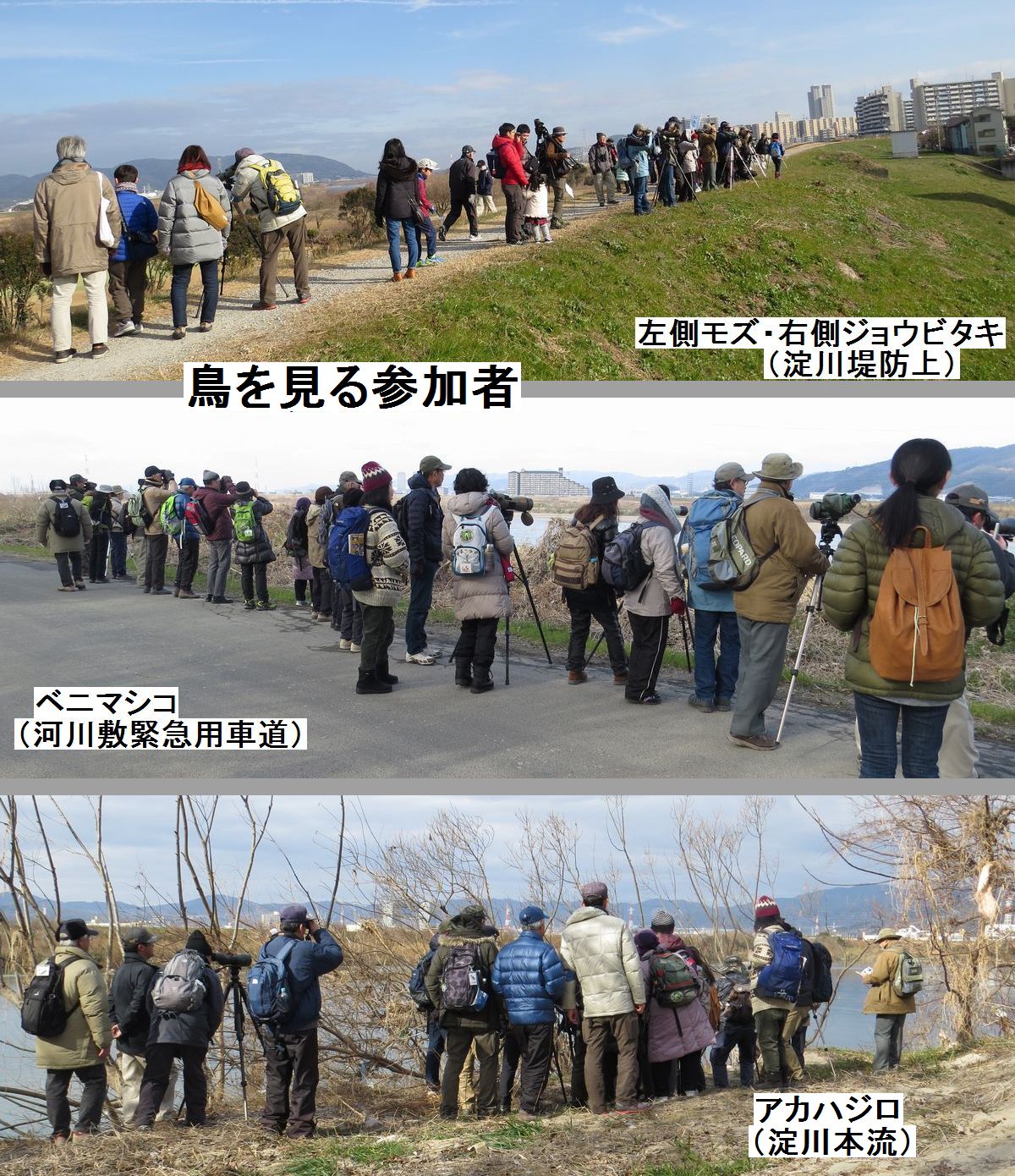 鳥を見る参加者3題:最上段には、淀川河川レンジャー観察会への参加者にお子さんも(撮影:平さん)