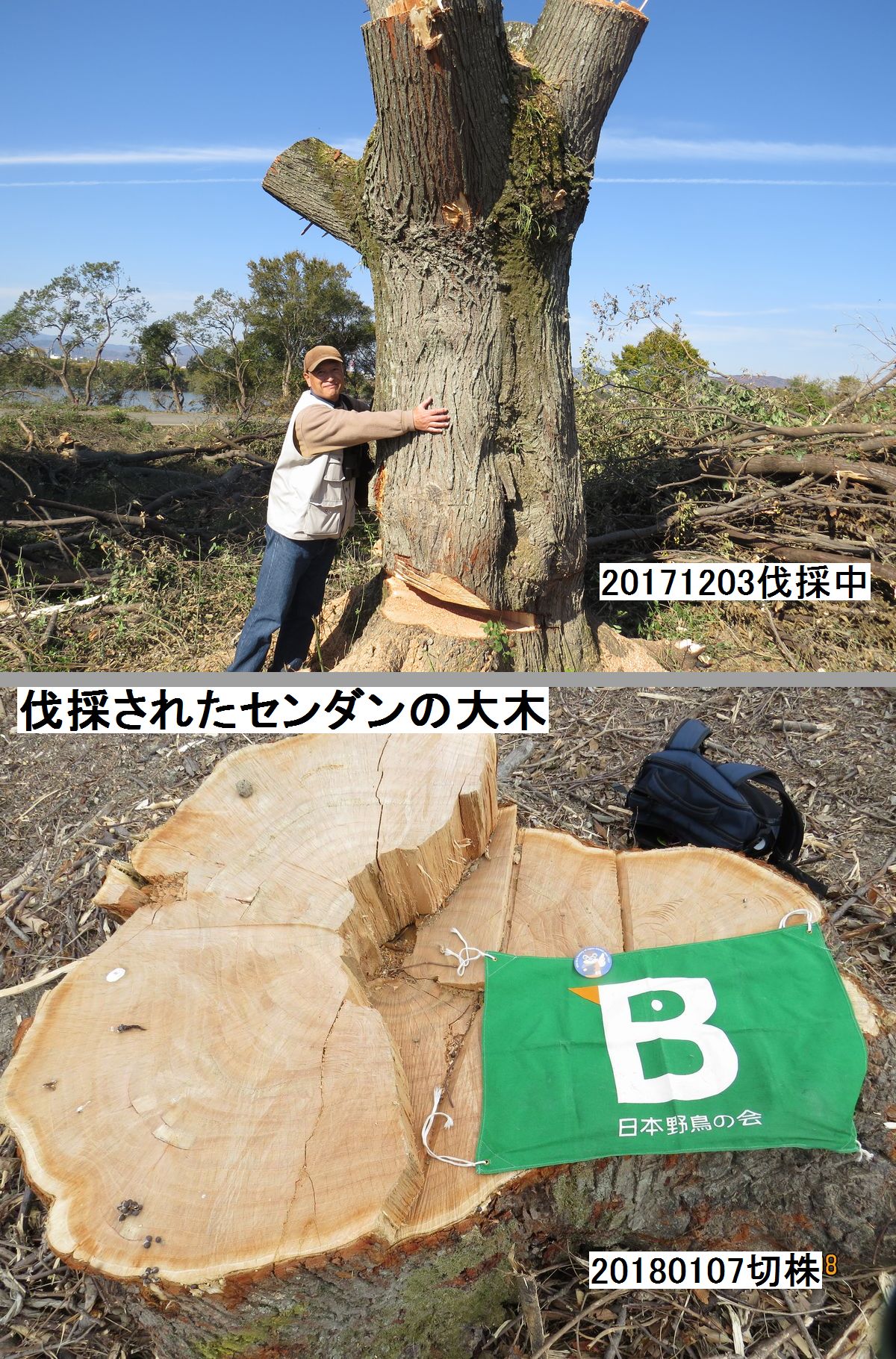 先月、切断中と紹介したセンダン大木の切株:日本野鳥の会旗の横幅が50㎝近くなので、センダンの長径は1mほどであった。
