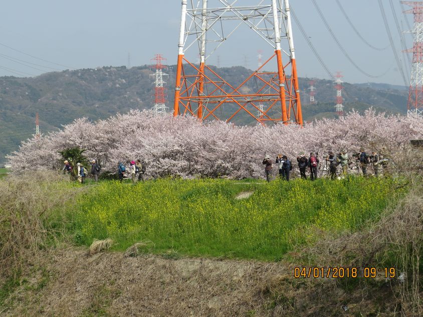 ・穂谷川堤防からモズ・ホオジロなどの鳥を見る参加者。手前黄色は堤防に咲くセイヨウカラシナ、奥は満開のソメイヨシノ、上部は高槻市安満山連山で白く見えるのはヤマザクラです。