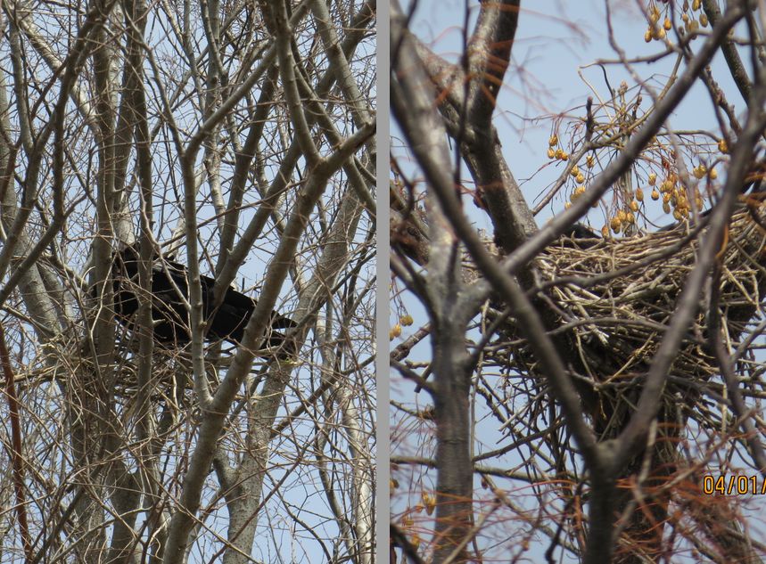 ・巣を作り中のハシボソカラスと抱卵中のハシボソガラス。