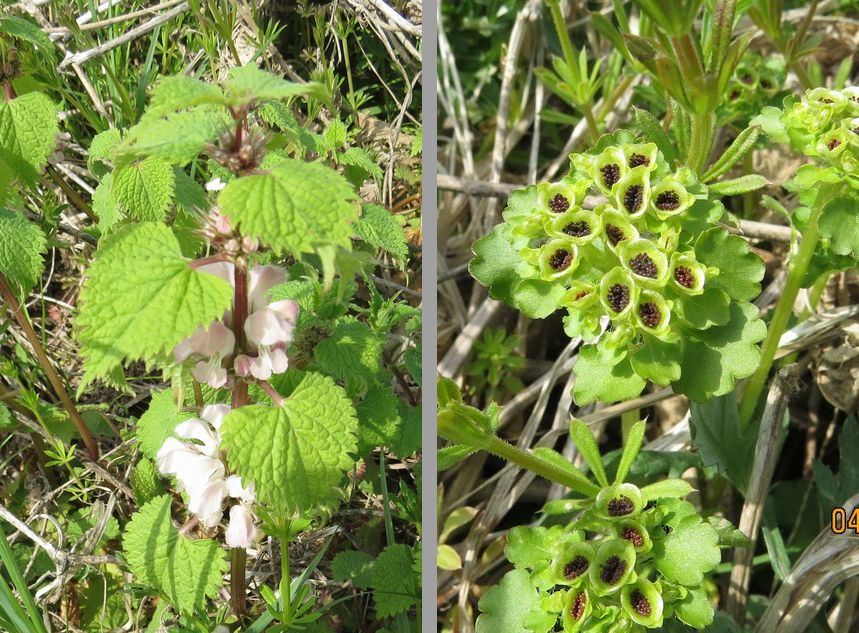 ・山地の谷川で見ることの多い野草、オドリコソウ・ネコノメソウ。洪水で上流から流れてきた種子が、冠水した高水敷に繁殖適地を見つけて花を咲かせます。