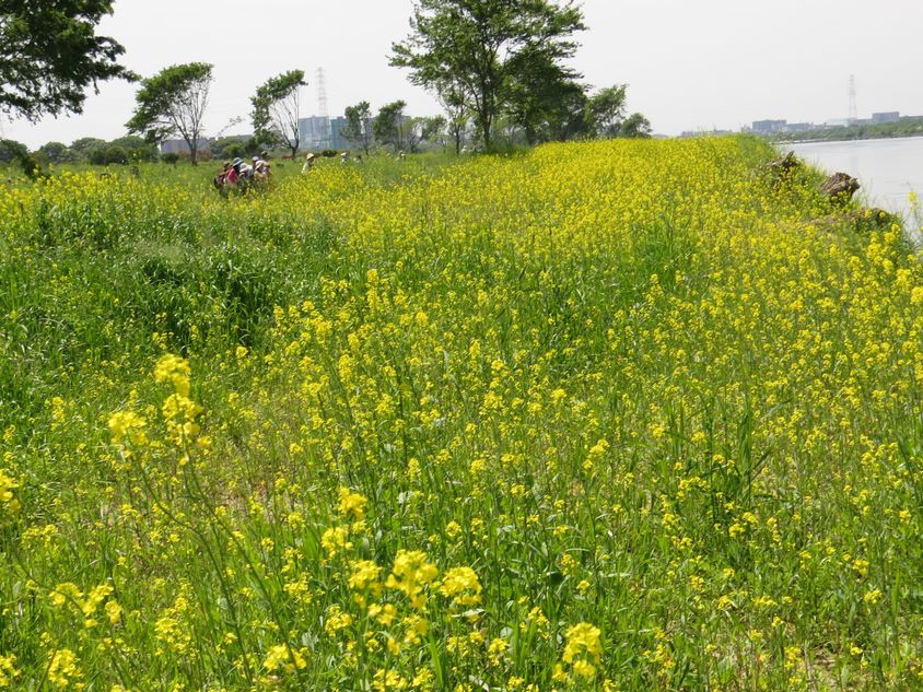 樹林が全伐された跡地に、1か月遅れで満開となったセイヨウカラシナ