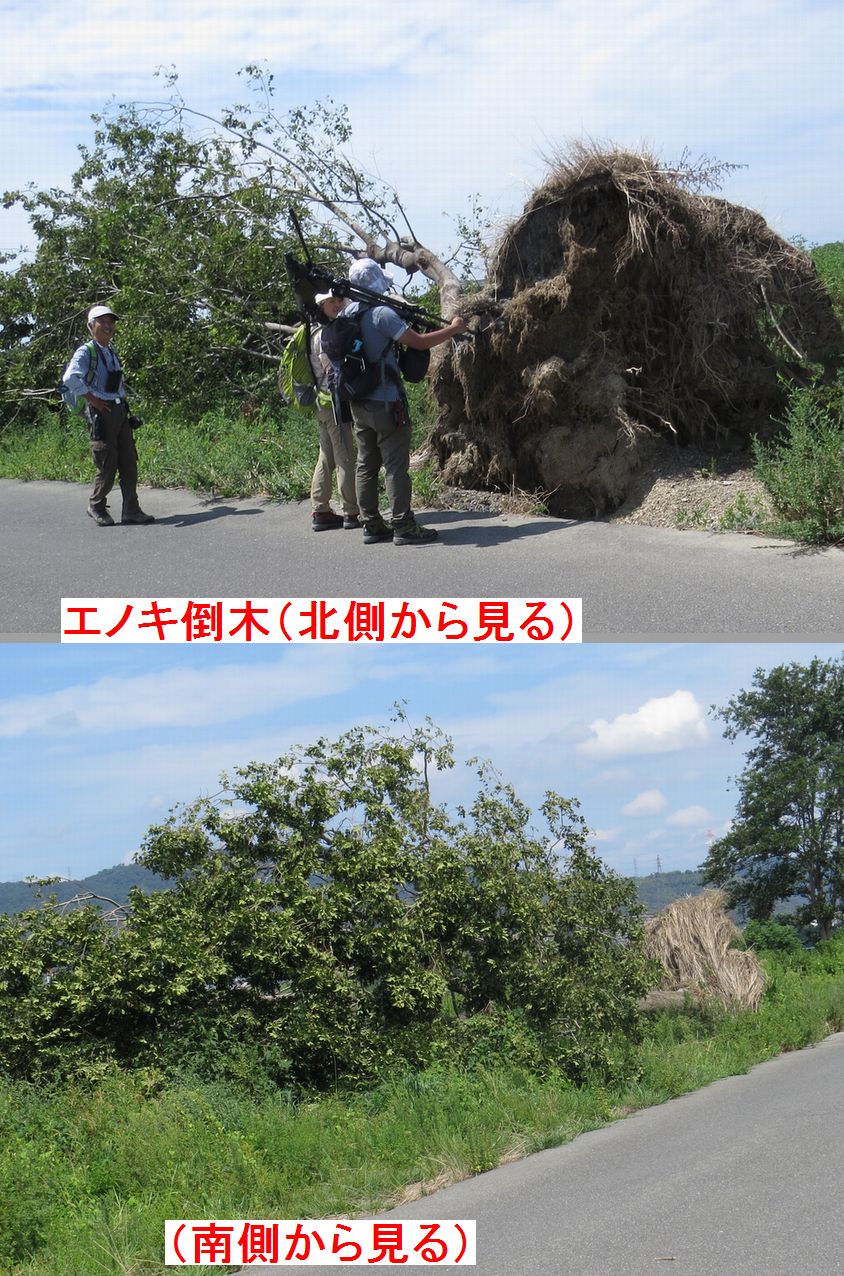 伐採せず残された40本余りの内の貴重な1本、エノキが先日8月23日の台風で倒れていました。太さは測っていませんが直径50㎝ほど、今まで樹林の中で他の木と支え合っていたのが1本だけ残され、根が浅いので倒れやすかったようです。(撮影:平さん)