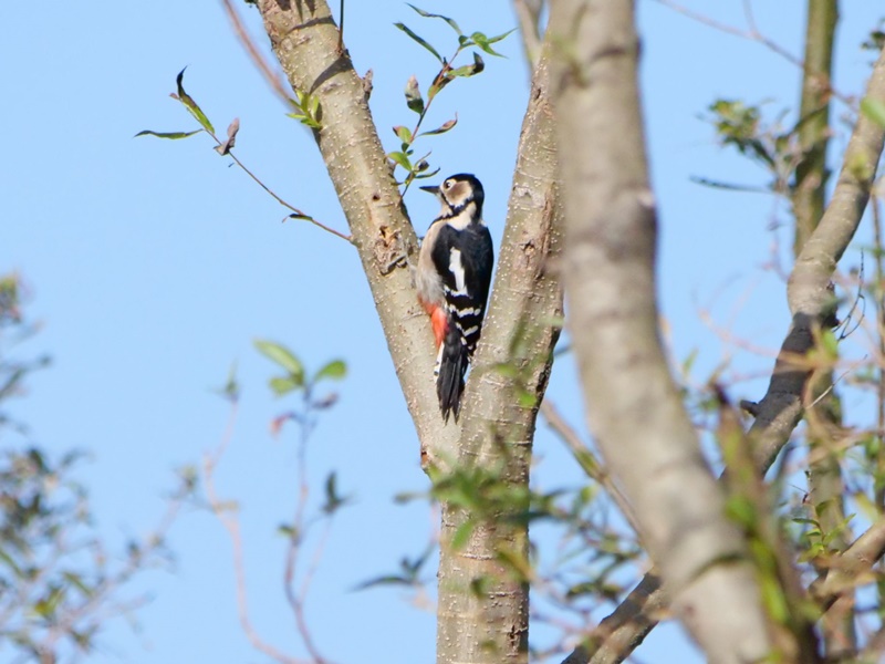 そして今日のトピックスはアカゲラ、先月は磯島グランド下流のセンダン林にいたが、今回は2㎞ほど上流で、1カ月後にで皆伐される予定の林の中にいて、全員で観察でき大感激でした。