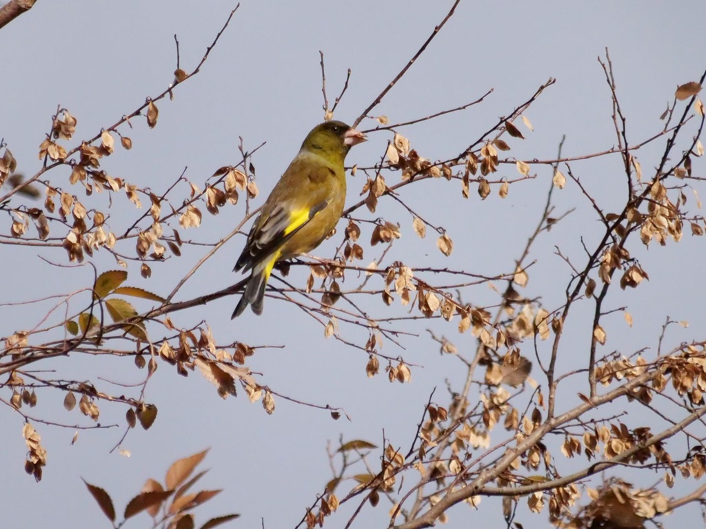 カワラヒワ:昼食時のアキニレに。ここでアトリやマヒワを見たことがあるのに、という話題が出ましたが、今日は両種とも0羽(撮影:沖光二さん)