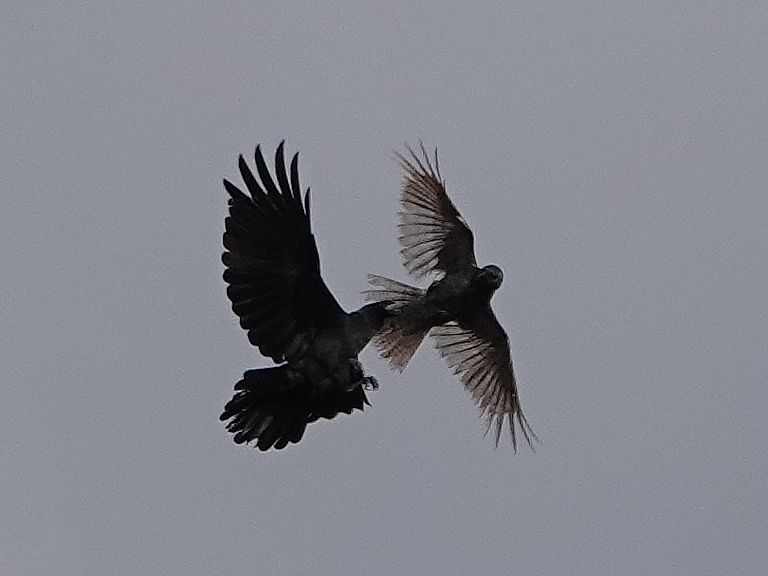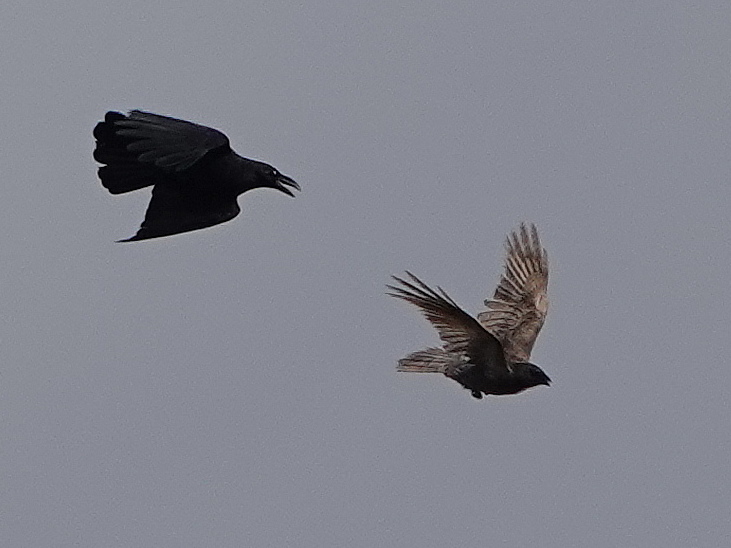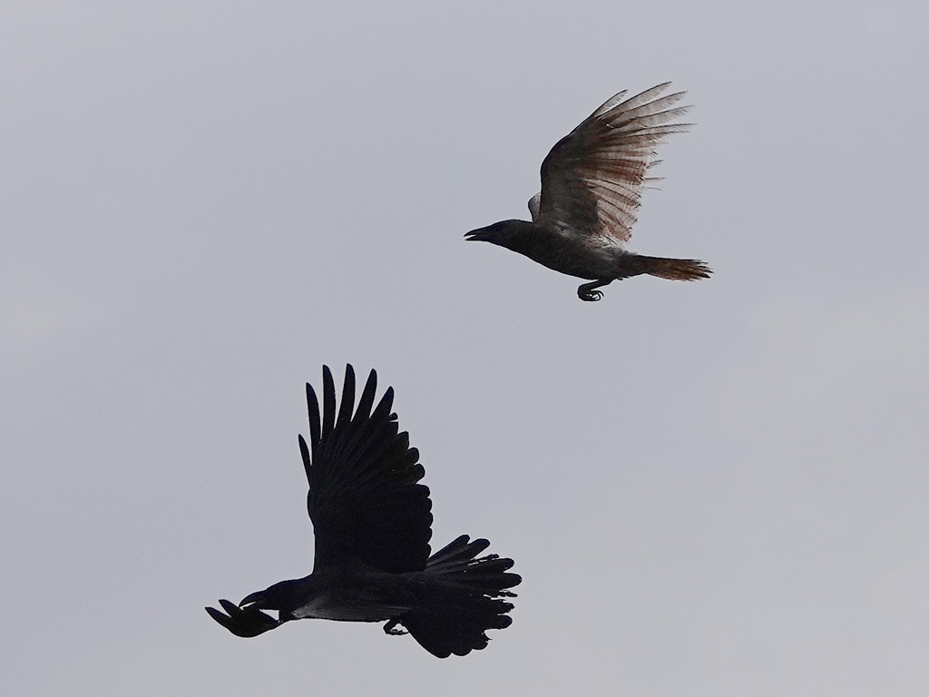 茶色いカラス2:茶色がラスが小さく別種のように見えたが、写真で見られる通り黒ガラスにつつかれて、羽が短くなっているためでした(撮影:堤潤さん)