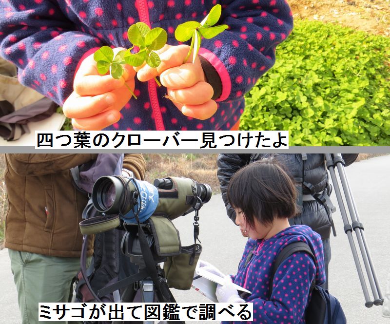 小学生参加:昼食時間に「四つ葉のクローバー」を何本も見つけ、タカ(ノスリ)が出ると図鑑で調べるなど、探鳥会を楽しんでいただきました(撮影:平さん)