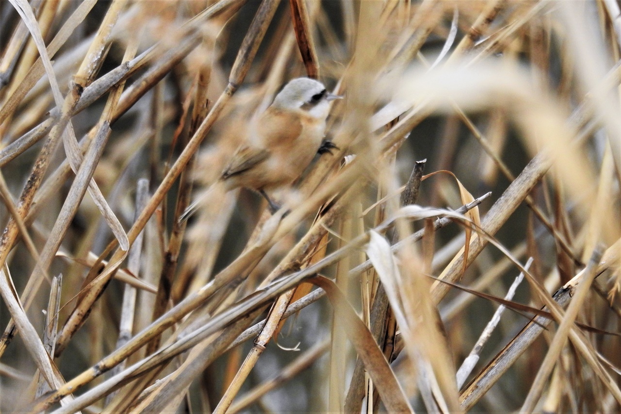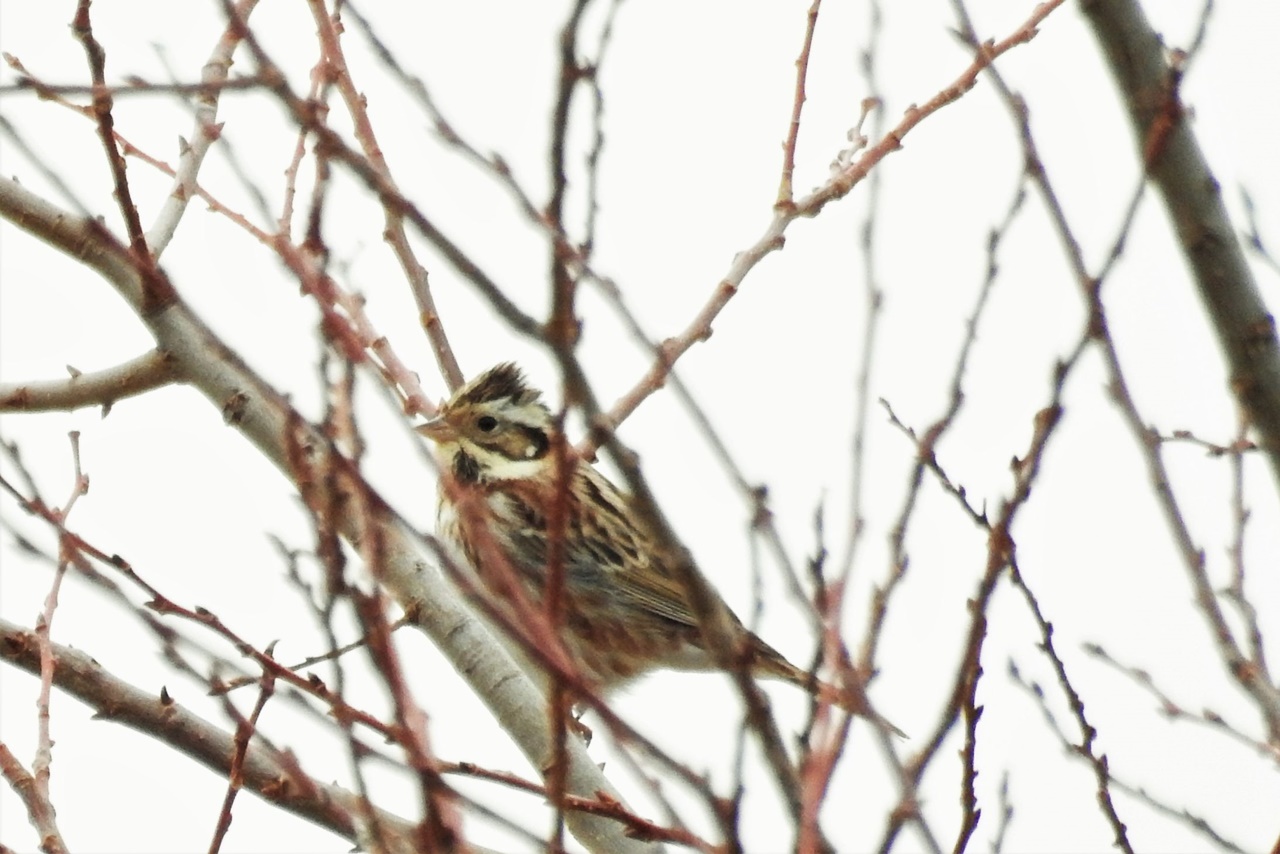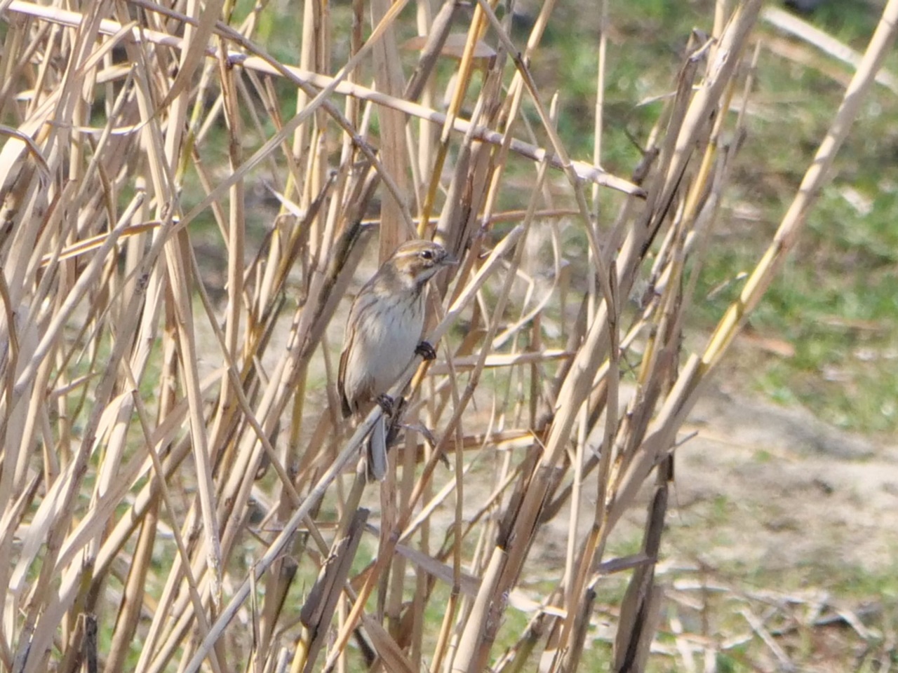 ウグイスのさえずりが響くヨシ原ではオオジュリンがヨシの茎に潜むカイガラムシをさがして飛び回り、すぐ近くで初記録のツリスガラも虫探しをしていた。