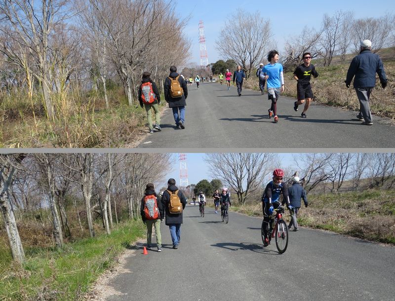 牧野ゴルフ場の本流側の木はすべて伐採され、日影がなくなり、冬の着ぶくれした装いでは汗ばむほどになった。尚、探鳥コースは自転車のほかに、明日開催される寛平マラソン出場者と思われる方の試走も多かった。