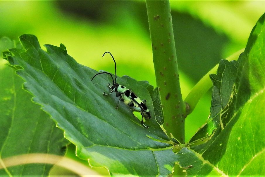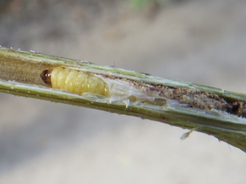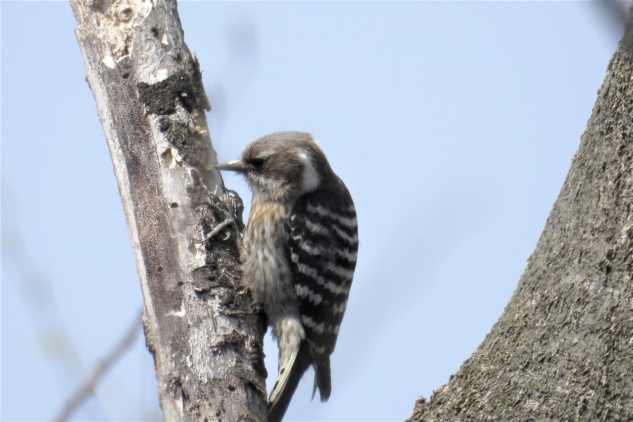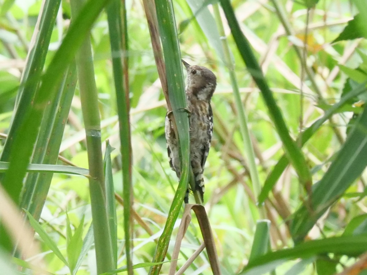 牧野ゴルフ場本流側の伐採された約3㎞の樹林跡の変化を注視しているが、2年前に伐採された所は埋土種子+鳥分散による種子から発芽したと思われるセンダン・ナンキンハゼ・クワ・アカメガシワなどの樹木が、2~3m高さまで成長していた。そんな草原中にある小さな木にシジュウカラが進出しており、更に樹木の全くない所でもコゲラの音、2~3m高のオオブタクサの茎をつついていた。オオブタクサの茎中に住む幼虫(文献ではスギヒメハマキと思われる)がおり、これを捕食していたらしい。
