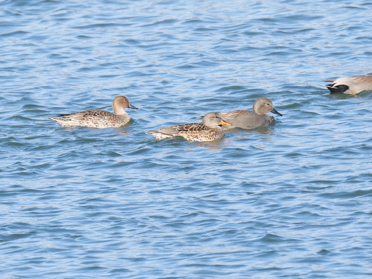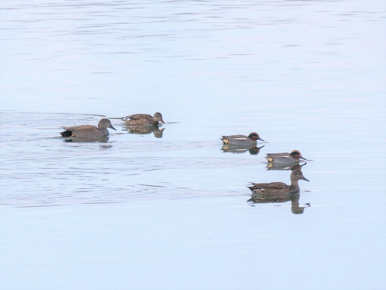①オカヨシガモ、オナガガモ、②コガモ、③ヨシガモエクリプス、④キセキレイ