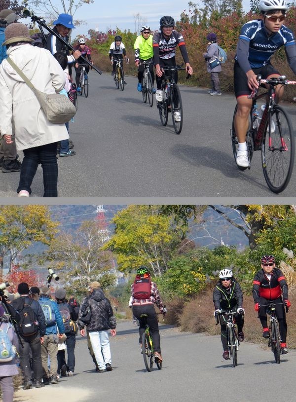 ①イソシギ、②コゲラ幼鳥、③モズ、④カラの混群を見ている所を自転車が通過