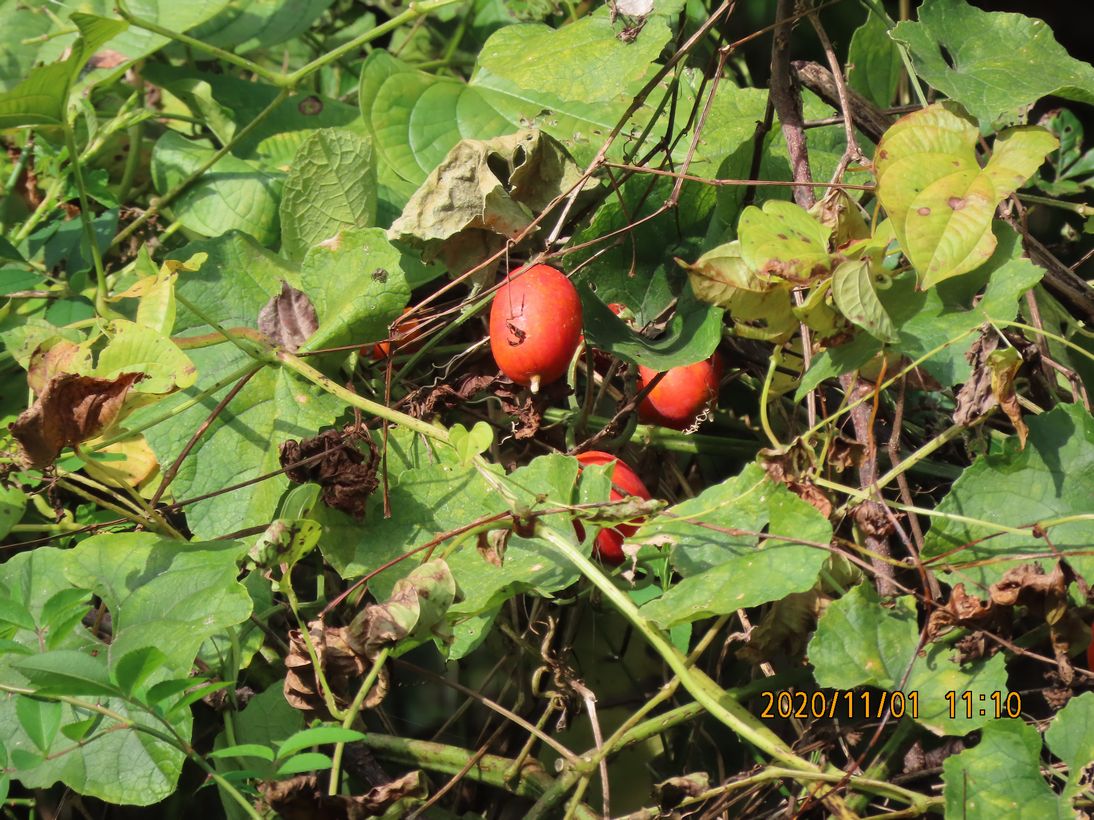 写真、左から、イソシ、モズ、カラスウリ、サイクリング自転車通過