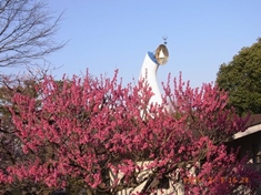 - 探鳥会では梅林を通りませんでしたが、満開の紅梅をバックに太陽の塔を
