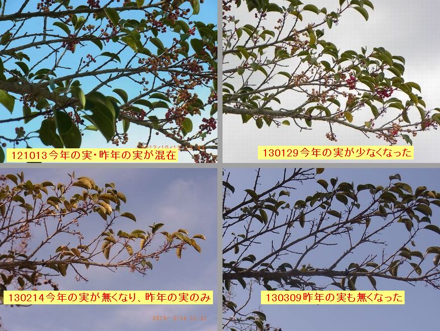 - 2月の探鳥会で2012年の実が先に食べられ2011年の実のみが残っていましたが、3月探鳥会ではすべて無くなっていました。